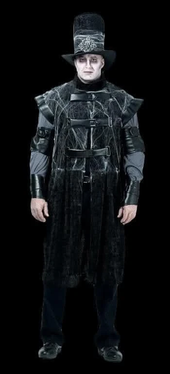 Overcoat with spider web accents, armbands, and tall hat with emblem and spider web detailing.